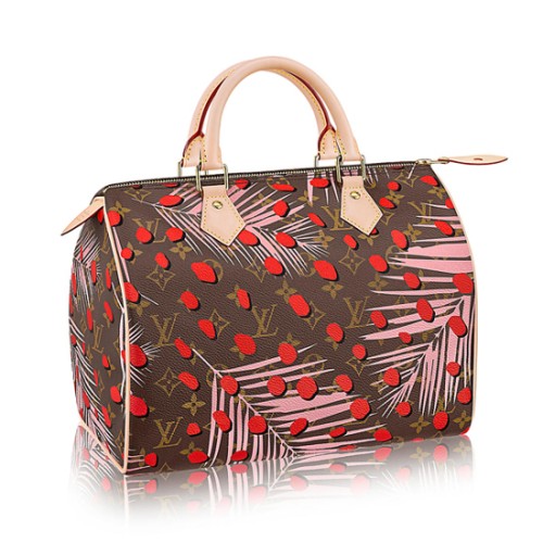 Palmy s emblematickým motivem Palm Springs evokují džungli s monogramy... Tento osvěžující a radostný vzor kombinuje stylový motiv palem z kolekce Cruise 2016 a tečky evokující divoká a tropická zvířata procházející palmovými listy. Model Speedy 30 kombinuje ikonický monogram s lehkým a ženským potiskem. Divoký a stylový, je ideální pro moderní a zářivý letní styl.